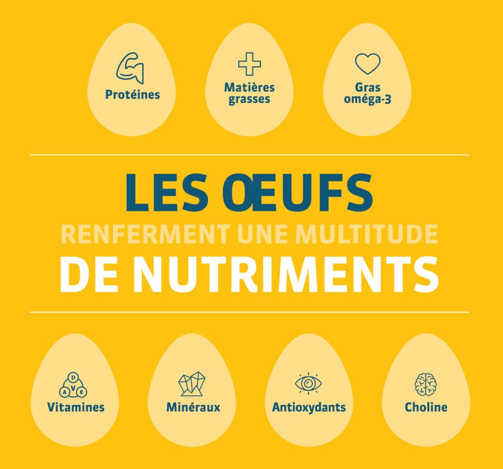 L’œuf renferme plusieurs vitamines essentielles à la santé, dont la vitamine A, le folate, la riboflavine, la vitamine B12, la vitamine D et la vitamine E.