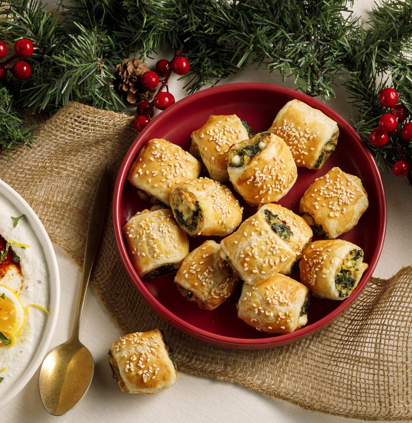 6. Sur le plan de travail fariné, déposer les feuilles de pâte feuilletée. Couper chaque feuille en deux bandes égales. Au centre et sur toute la longueur de chaque bande, répartir la garniture aux épinards. Rabattre un côté sur la garniture et le badigeonner d’œuf battu. Rabattre l’autre côté sur le côté badigeonné. Retourner les bandes, joint dessous.