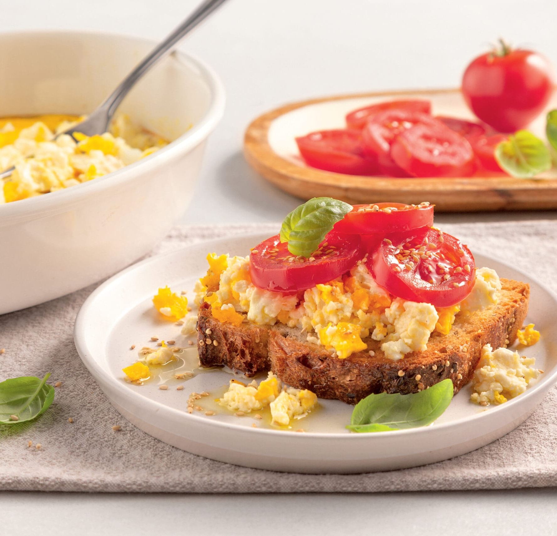 6. Répartir la préparation à la feta sur les tranches de pain. Garnir de tranches de tomates et de graines de sésame, puis arroser d’un filet d’huile d’olive.