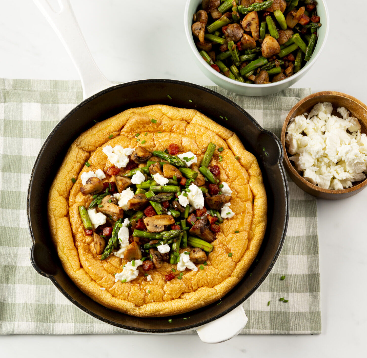 11. À la sortie du four, garnir l’omelette de légumes et de pancetta. Arroser de sirop d’érable. Parsemer de ciboulette et de fromage de chèvre.